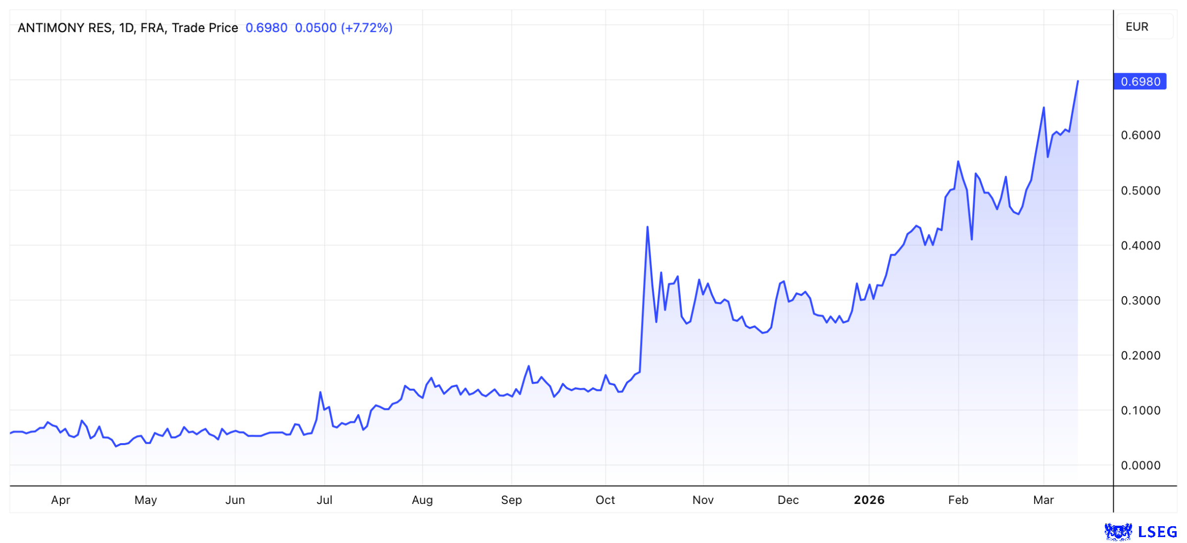 Es kristallisiert sich mehr und mehr heraus, dass das Unternehmen mit dem Bald Hill Projekt in Kanada über ein herausragendes Antimon-Vorkommen verfügen könnte. Inzwischen wurden in vier voneinander getrennten Bereichen massive antimonhaltige Stibnitmineralisierung nachgewiesen. Derzeit läuft ein 10.000-Meter-Bohrprogramm. Nach den ersten 4.000 Metern hatte Antimony Resources kürzlich ein überzeugendes Update gegeben. Das gesamte Programm soll bereits im April beendet werden. Anfang Juni will man eine erste Ressource veröffentlichen. Der NI-43-101-Report schätzt das Projektpotenzial auf rund 2,7 Mio. Tonnen mit 3 % bis 4 % Antimongehalt. Bestätigen die aktuellen Bohrungen dies, dürfte das Vorkommen Milliarden wert sein. Dabei ist zu berücksichtigen, dass sich der Preis für Antimon weiter nach oben bewegen dürfte und weitere Gebiete erkunden werden. An der Börse wird das Unternehmen derzeit mit 100 Mio. CAD bewertet.
