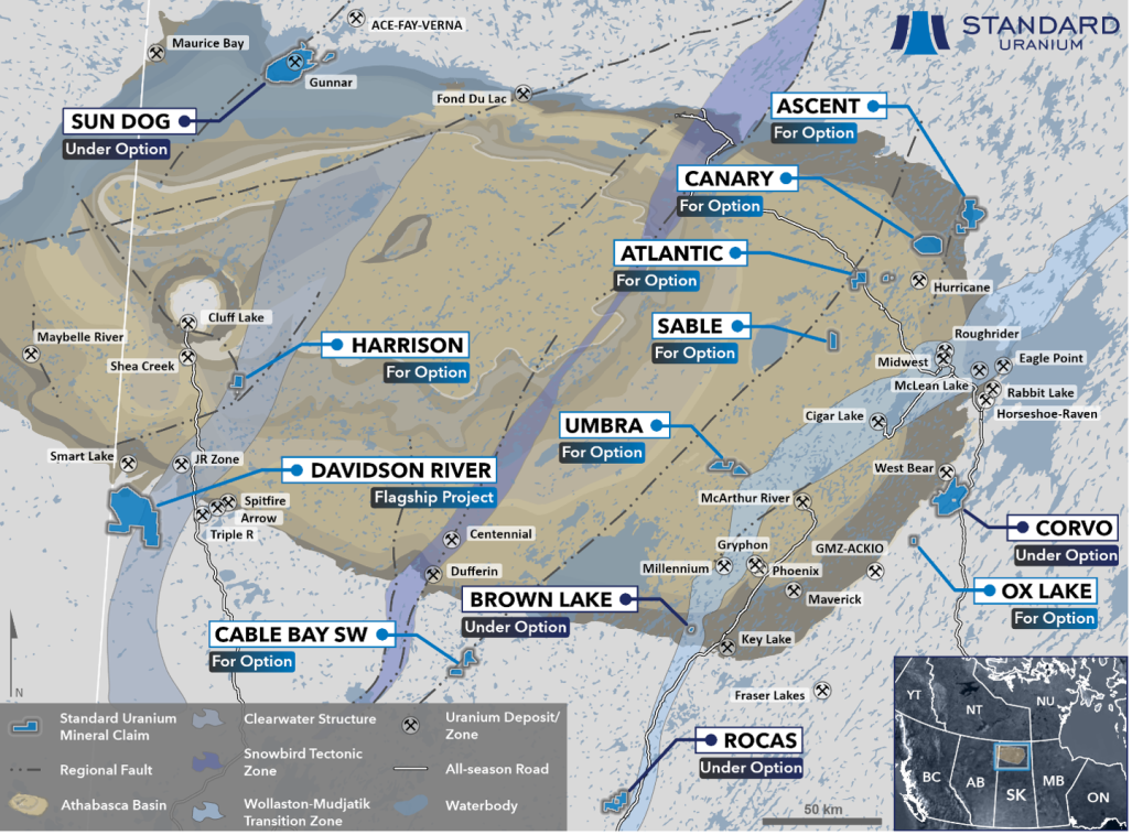 Das aktuelle Portfolio von Standard Uranium umfasst 13 hochwertige Uran-Explorationsprojekte in uranreichen Distrikten des Athabasca-Beckens. Über die Gesamtfläche von mehr als 95.000 Hektar verteilen sich 57 Claims. Das Flaggschiffprojekt ist Davidson River. Neu hinzugekommen ist zuletzt das Harrison-Projekt. Es liegt im Südwesten des Athabasca-Beckens. Dort befindet sich unter anderem die Triple R Lagerstätte von Fission Uranium und das Arrow-Projekt von NexGen Energy. F3 Uranium hat dort zuletzt hochgradige Funde gemeldet.