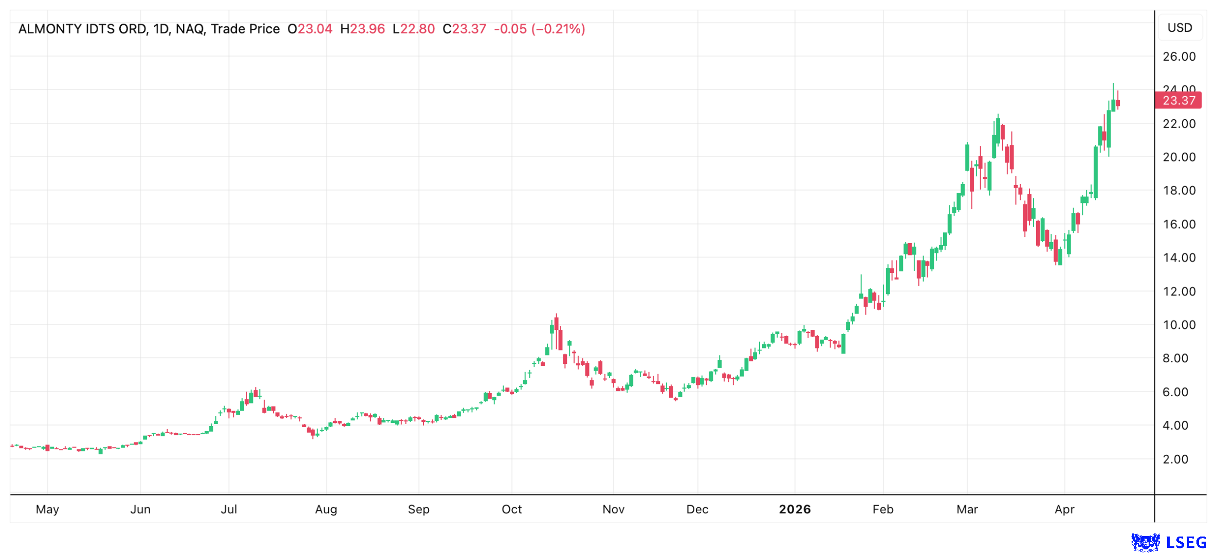 Die Analysten trauen dem Wolframproduzenten im laufenden Jahr bereits eine Verzehnfachung des Umsatzes auf 472,3 Mio. CAD zu. Im kommenden Jahr sollen sich die Erlöse noch einmal auf 1,2 Mrd. CAD mehr als verdoppeln. Dann soll der Gewinn je Aktie bei 3,21 CAD liegen. Die Almonty-Aktie – sie wird auch in Deutschland stark gehandelt – notiert derzeit bei 31,90 CAD.