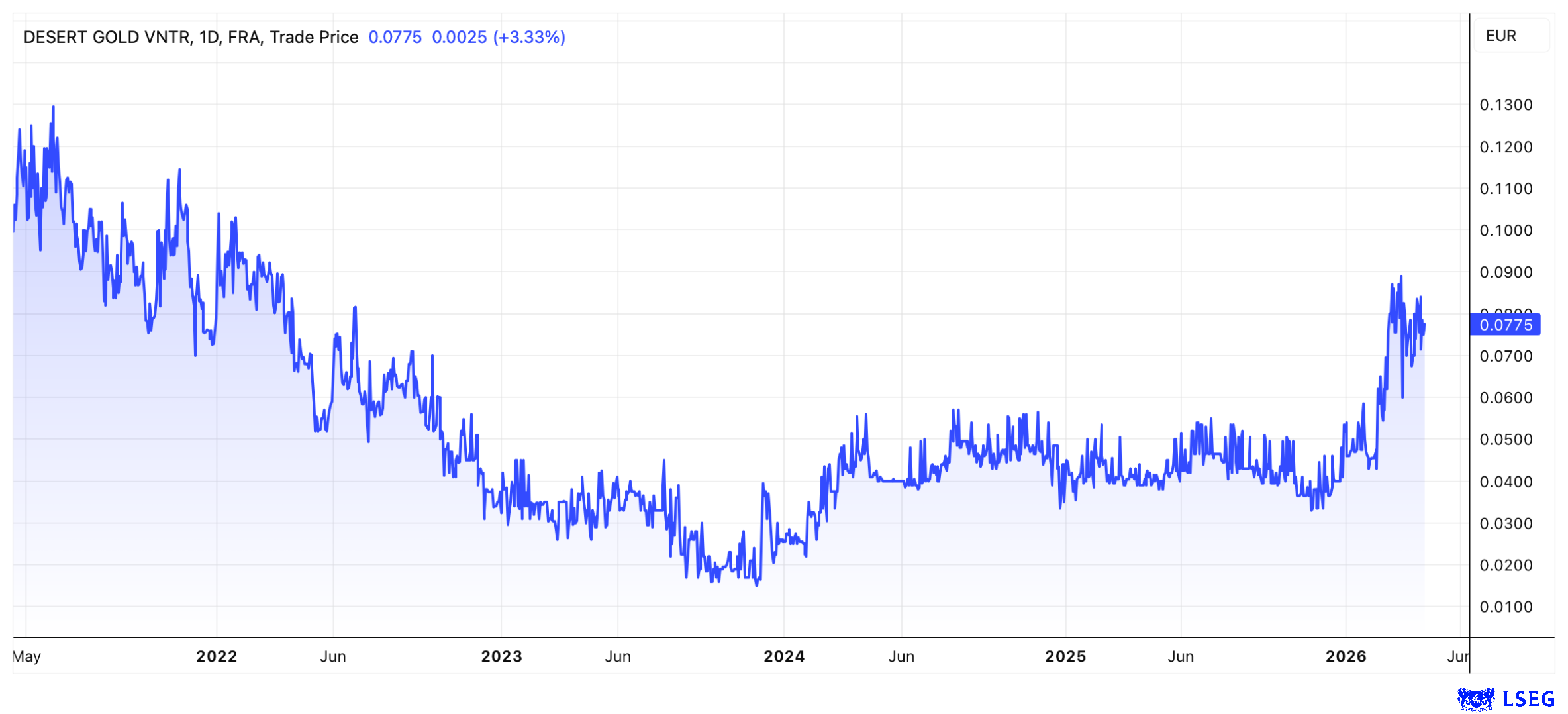 Während Gold seine Korrektur beendet und sich der Blick auf die Rückeroberung der 5.000-USD-Marke richtet, startet eine Gold-Aktie bereits richtig durch. Analysten halten sogar eine Rally von mehr als 500 % für möglich. Denn Desert Gold will in diesem Sommer erstmals Gold produzieren. Dabei wird das Unternehmen immer noch mit weniger als 25 Mio. EUR bewertet. Dies erscheint den Analysten viel zu wenig zu sein. Denn neben dem Start der Produktion arbeitet das Unternehmen an der Erweiterung der Ressource. Außerdem gibt es Übernahmefantasie.