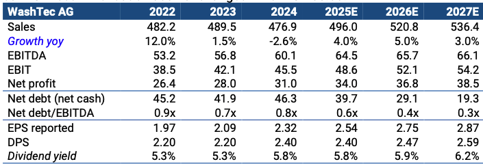 Analysten von mwb research trauen dem Unternehmen jedenfalls einiges zu. Nach einem Umsatz von 496 Mio. EUR im laufenden Jahr sollen es in 2026 bereits 520,8 Mio. EUR sein und in 2027 dann 536,4 Mio. EUR. Das EBIT soll von 48,6 Mio. EUR in 2025 bis 2027 auf 54,2 Mio. EUR klettern. Die Dividende soll bis dahin auf 2,59 EUR je Aktie zulegen. Entsprechend sehen die Analysten den fairen Wert der WashTec-Aktie bei 55 EUR.