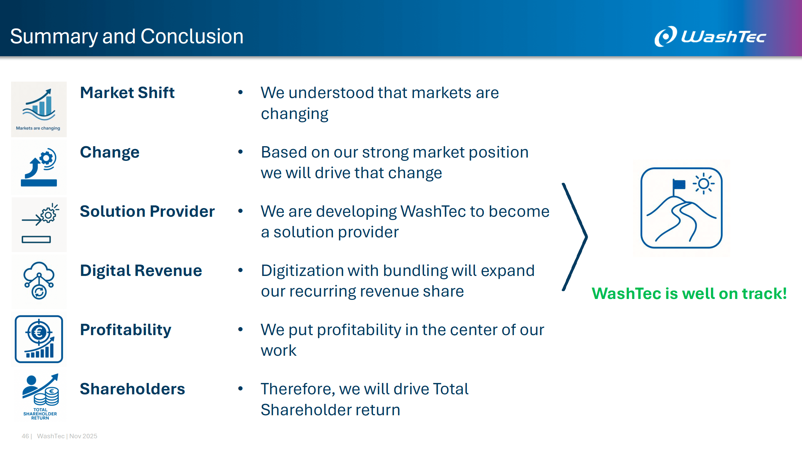 Auch WashTec selbst sieht in der Unternehmensbewertung offenbar eine attraktive Kaufchance. So wurde vergangene Woche der Rückkauf eigener Aktien über die Börse gestartet. Dazu betonte WashTec-Vorstandsvorsitzender Michael Drolshagen die positiven Aussichten: "Die hervorragenden Ergebnisse des dritten Quartals bestätigen, dass WashTec operativ auf einem sehr guten Weg ist, um die kurz- und mittelfristigen Ziele zu erreichen. Das Geschäftsmodell von WashTec erwirtschaftet hohe Cashflows und unsere Aktie steht für hohe Ausschüttungen an ihre Aktionäre. Mit dem heute gestarteten Aktienrückkaufprogramm setzen wir ein klares Zeichen für unsere Überzeugung in die langfristige Wertentwicklung der WashTec AG."